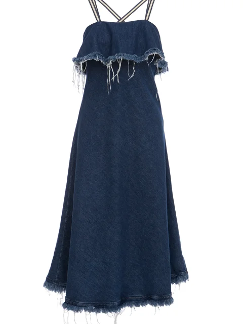 Детали: крой по фигуре, расклешённый книзу, длина миди, бретели из тесьмы, переплетающейся на спинке. Необработанная оборка по верхнему краю, потайная молния сбоку, бахрома по подолу.