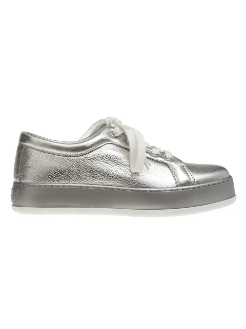 Детали: прошитая прямая подошва с перламутровым эффектом высотой 2 см, металлизированная кожа, белая шнуровка, внутренняя отделка белой кожей.