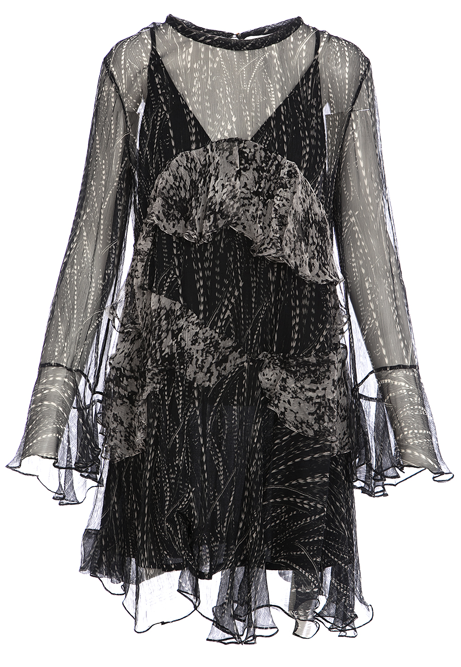 Детали: прямой крой, асимметричная длина, длинный втачной рукав с широкой оборкой по краю, контрастные оборки на полочке, круглый вырез горловины, застёгивается на спинке пуговицей с вырезом каплей. Подклада – комбинация.