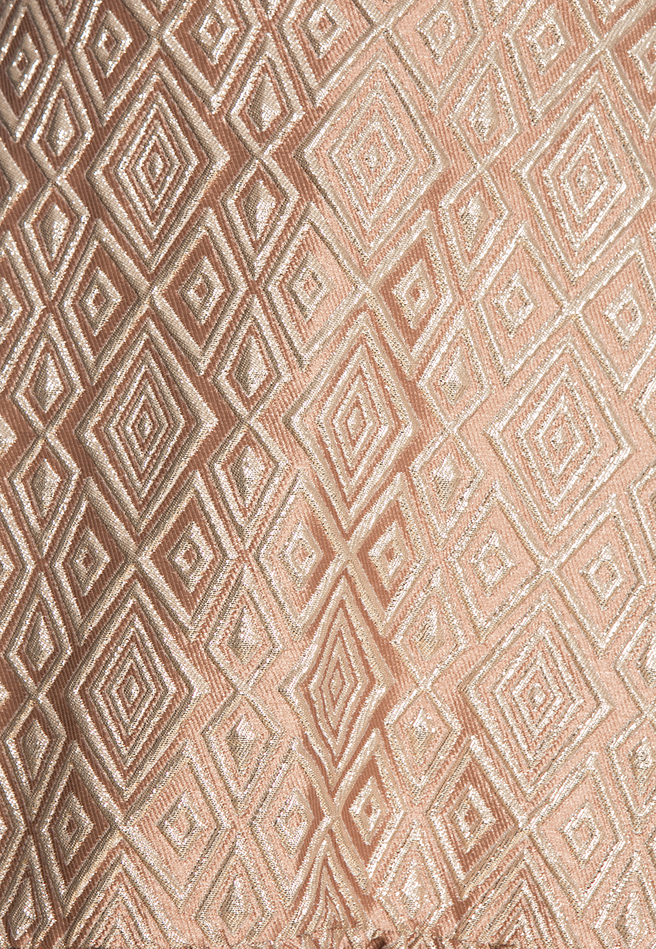 Детали: облегающий крой лифа, круглый вырез горловины, без рукавов, отрезная линия талии, заниженная линия юбки. Пышная юбка со сборками от линии бёдер. На спинке потайная молния. Жаккардовый геометричный узор.