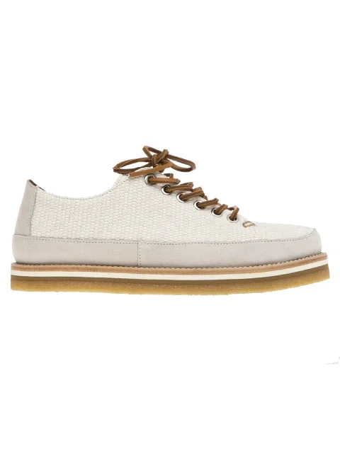 Детали: прямая трехслойная подошва высотой 2,5 см, кожаная вставка на носке, верхняя часть из рафии, шнурки из кожи.