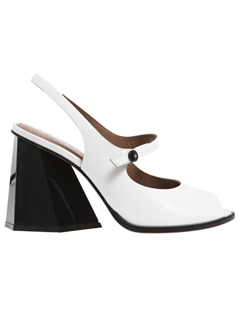 Детали: гладкая кожа, открытый мысок, перепонка на подъёме, застёгивается пуговицей. Пятка фиксируется тонкой перепонкой. Устойчивый шестиугольный каблук, глянцевый чёрный, высота – 8 см.