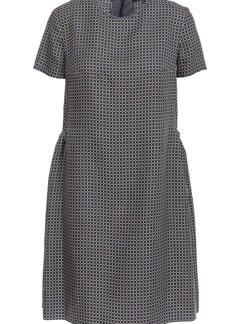Детали: трапециевидный крой от груди, круглый вырез горловины, короткий втачной рукав, длина выше колена, по бокам прорезные карманы, галстучный монохромный принт в клетку. Застегивается потайной молнией на спинке.