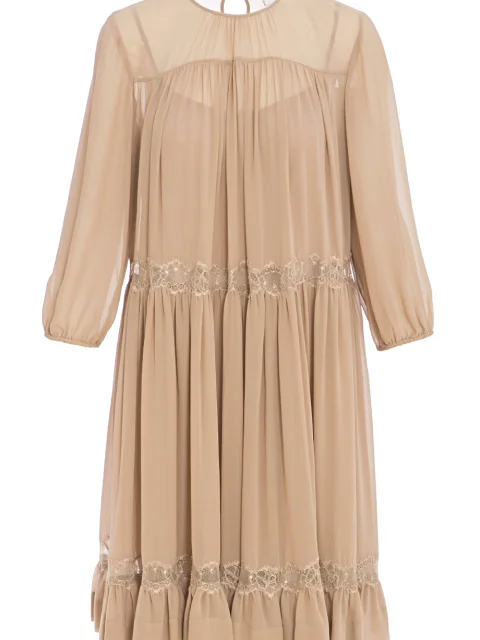Детали: свободный воздушный крой, кокетка над грудью, круглый вырез горловины, втачной рукав длиной ¾ с тонкой манжетой. Ярусы оборок разделены кружевом, небольшая рюша по подолу. Застегивается пуговицей на спинке с вырезом-каплей.