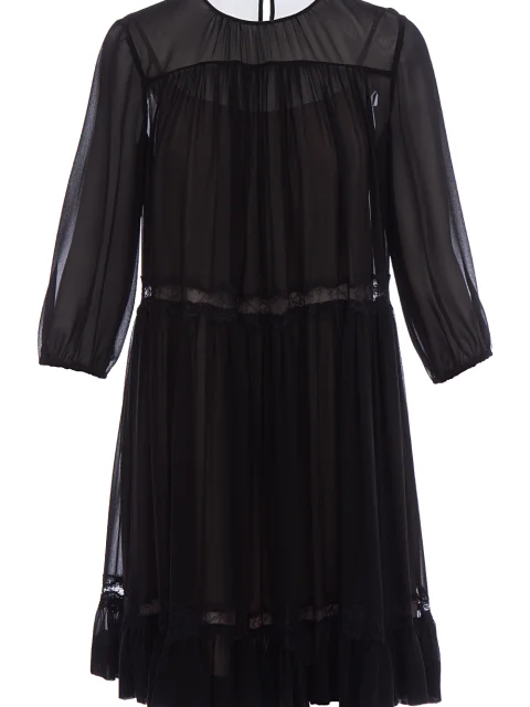 Детали: свободный воздушный крой, кокетка над грудью, круглый вырез горловины, втачной рукав длиной ¾ с тонкой манжетой. Ярусы оборок разделены кружевом, небольшая рюша по подолу. Застегивается пуговицей на спинке с вырезом-каплей.