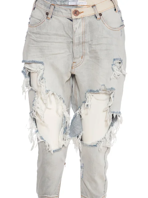 Детали: высокая посадка, крой зауженный книзу, пять традиционных карманов, разрезы по внутренним швам, края с поторочкой и бахромой. Крупные прорехи на коленях.