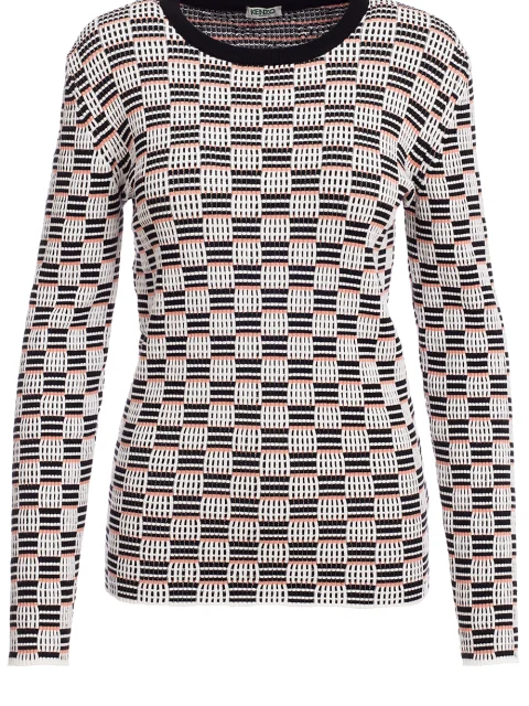 Детали: облегающий крой, круглый вырез горловины с контрастной отделкой, длинный втачной рукав, шахматное жаккардовое плетение.