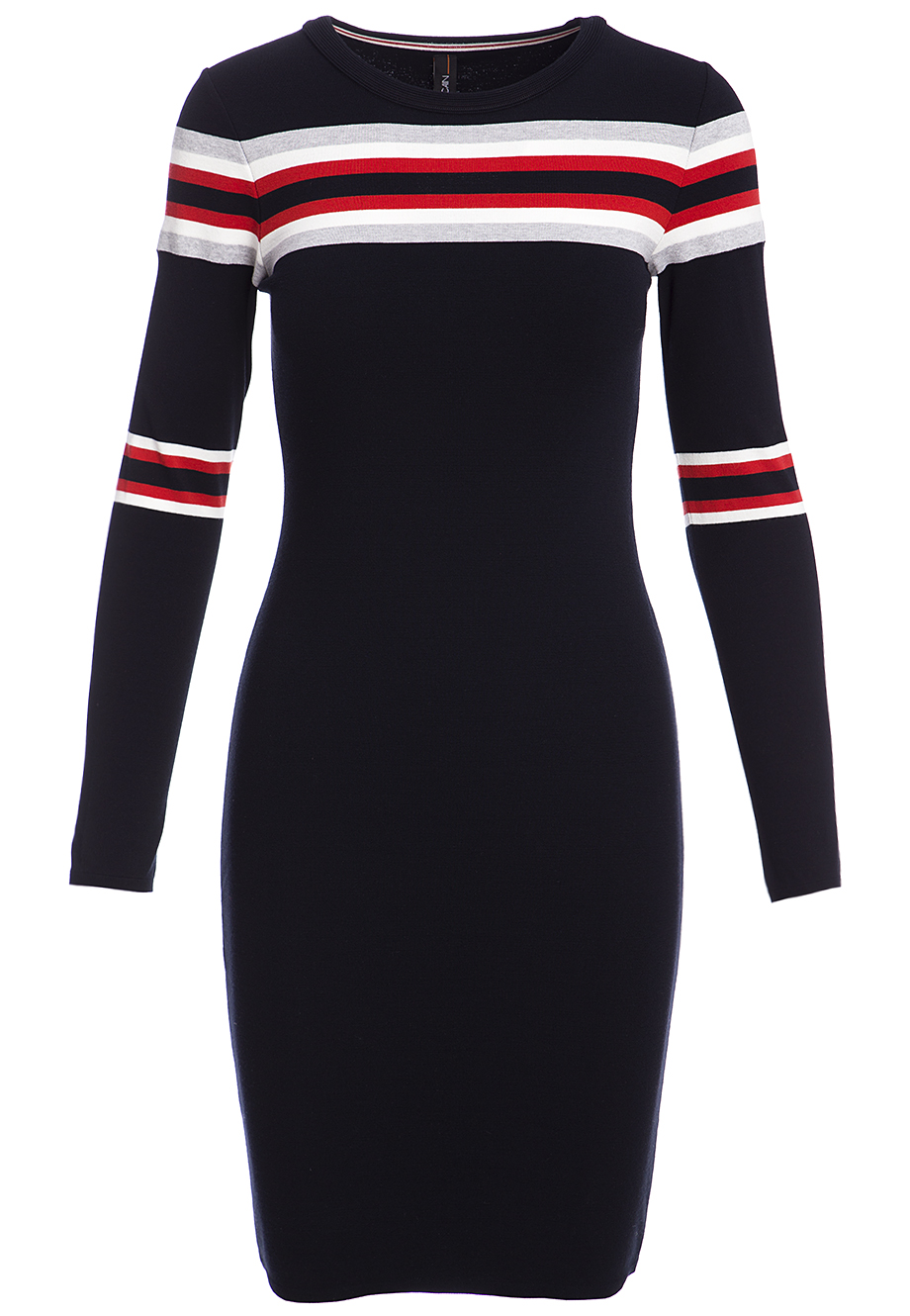 Детали: облегающий крой, круглый вырез горловины, длинный втачной рукав, рисунок в цветную полоску на груди, длина выше колена.