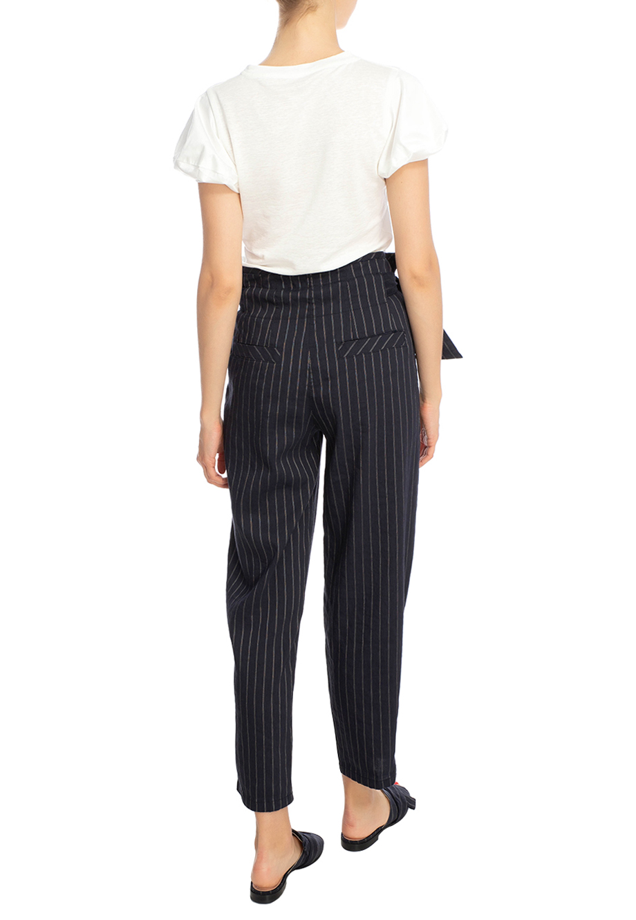 Детали: традиционный крой, высокая посадка, пояс с оборкой, сзади два накладных кармана, длина 7/8, дополнительный пояс с затягивающейся двойной пряжкой, принт в полоску.