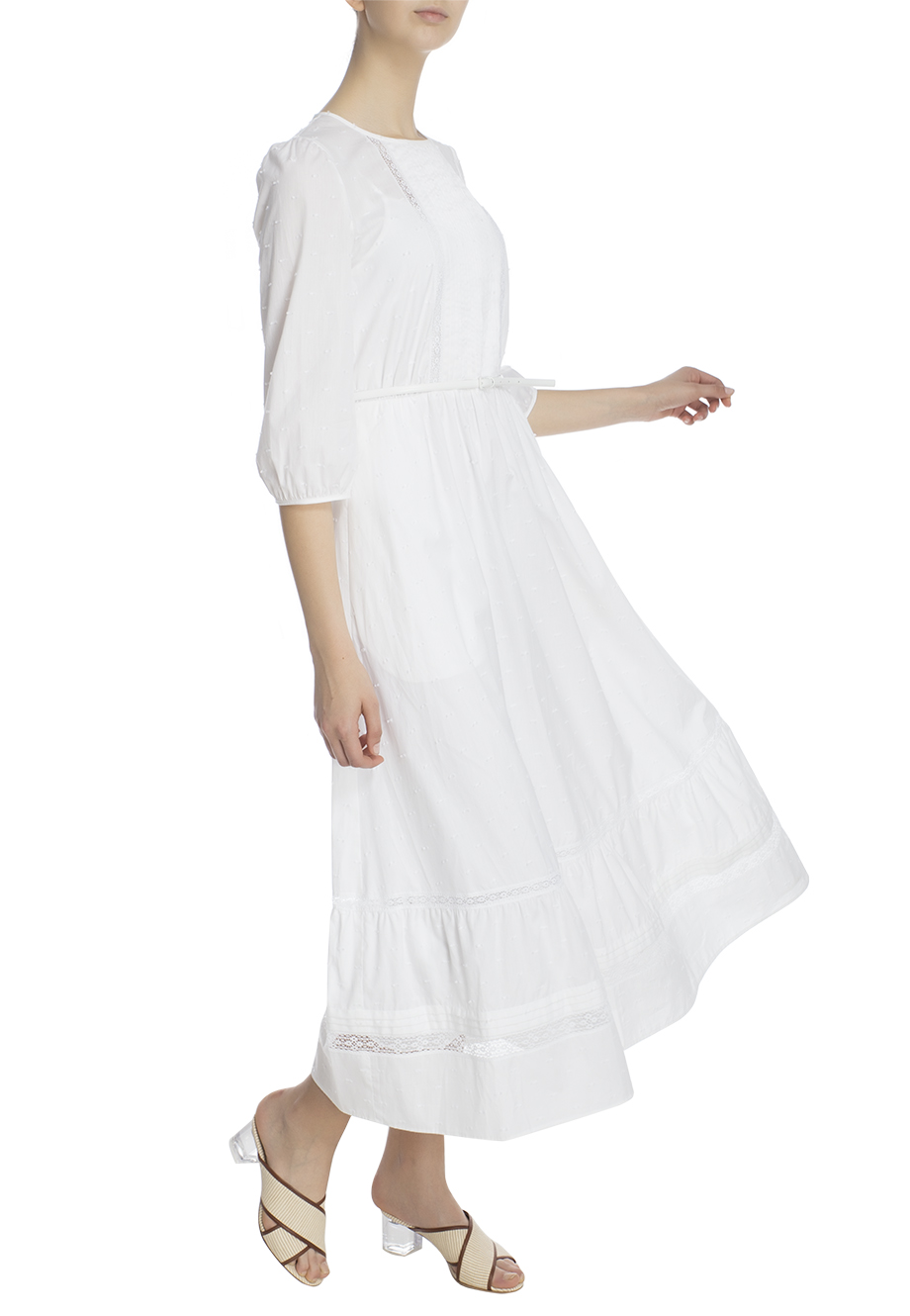 Детали: А-силуэт, круглый вырез горловины, втачной рукав длиной 7/8 собранный тонкой манжетой, манишка на груди, отрезная линия талии, юбка с двойным воланом по подолу. Тонкий ремешок по линии талии. Длина миди, декор кружевом.