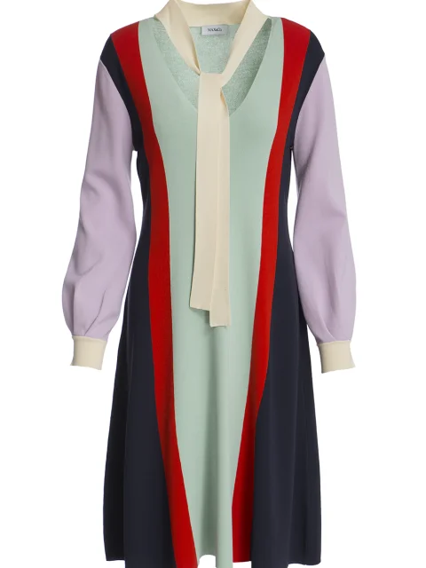 Детали: А-силуэт, V-образная форма декольте с шейной лентой, длинный втачной рукав, собранный манжетой, контрастные цвета, длина миди.