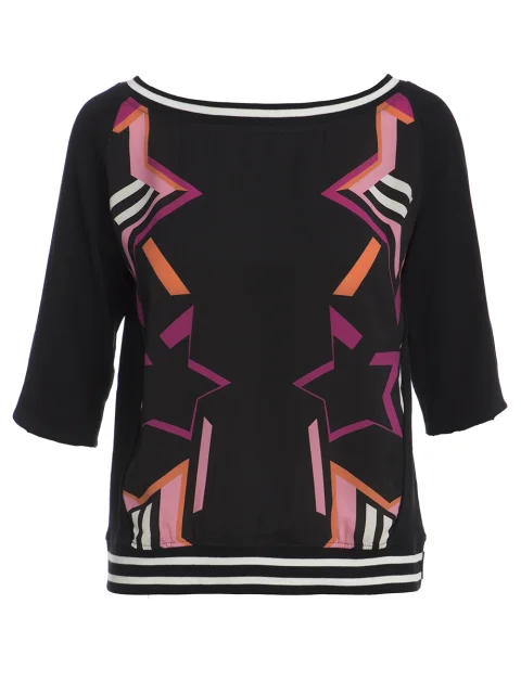 Детали: прямой свободный крой, вырез горловины лодочкой с контрастным кантом, рукава реглан длиной до локтя, манжета по нижнему краю, графический принт со звёздами.