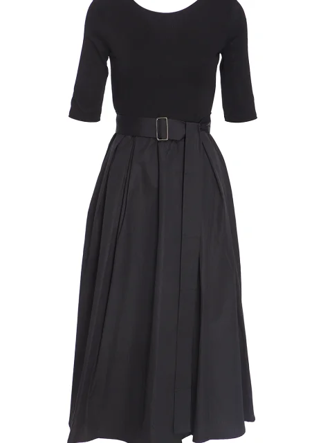 Детали: А-силуэт, топ из вискозного джерси, круглый вырез горловины с мысом на спинке, втачной рукав длиной ¾, отрезная линия талии, юбка с глубокими складками из поплина, пояс с пряжкой по линии талии, длина миди.