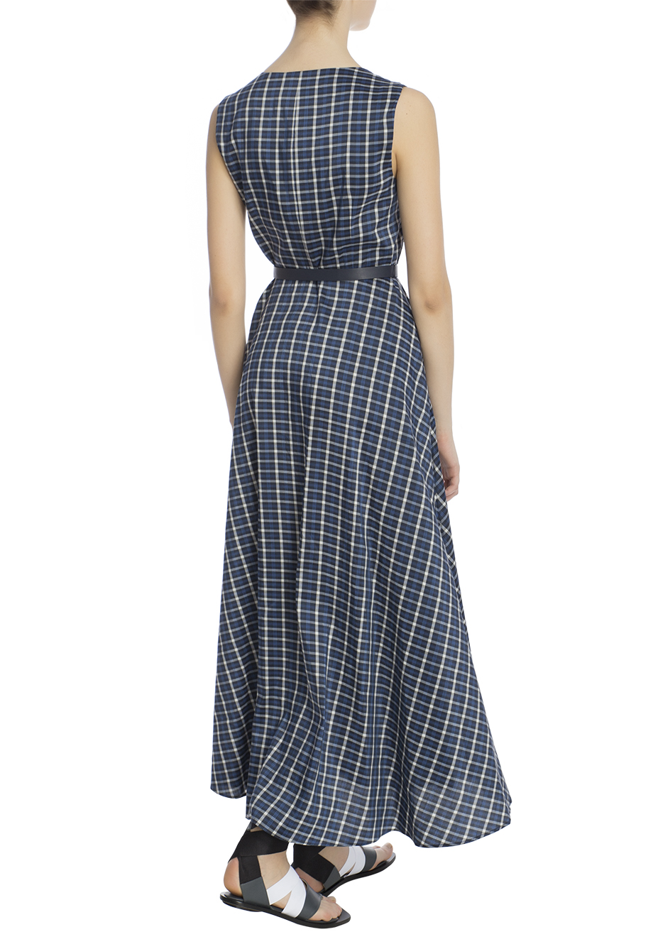 Детали: А-силуэт, V-образная форма декольте, пояс по линии талии, длина миди, глубокие складки, принт в клетку.