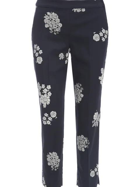 Детали: прямой укороченный крой, слегка зауженный книзу, французские боковые карманы, полированный хлопок с легким отблеском, потайной крючок, ширинка, монохромный цветочный принт.