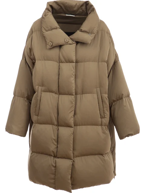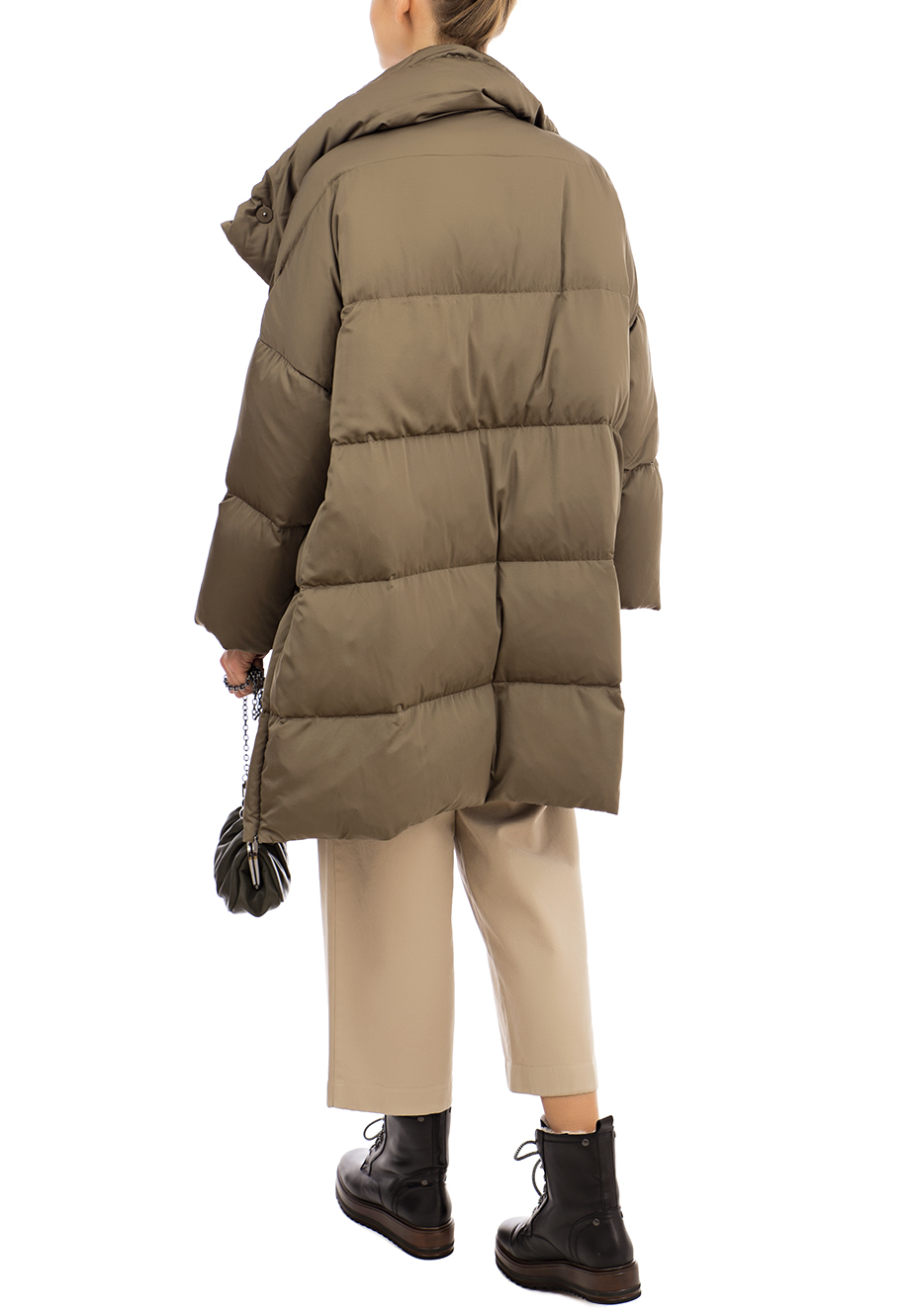 Детали: свободный крой, высокий ворот, прорезные карманы с рантом по бокам, длинный спущенный рукав, по боковым швам молнии, объемная перестёжка. Утеплитель – пух/перо (90/10%). Застегивается скрытыми кнопками.