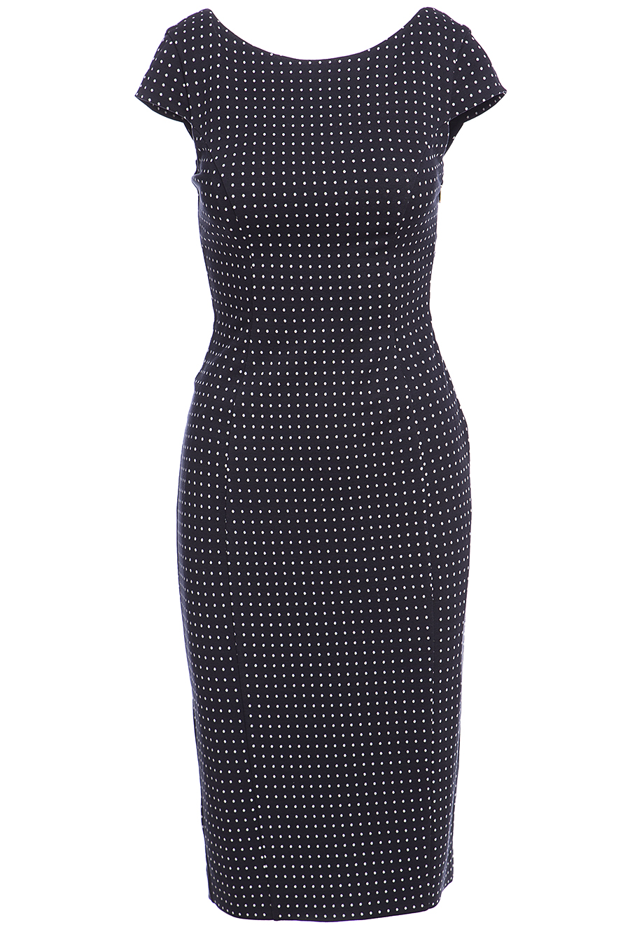 Детали: облегающий силуэт, круглый вырез декольте, короткий втачной рукав, длина ниже колена.