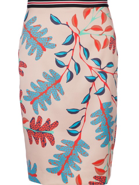 Детали: облегающий крой, высокая посадка, контрастный пояс, на спинке молния по шву. Флористический принт.