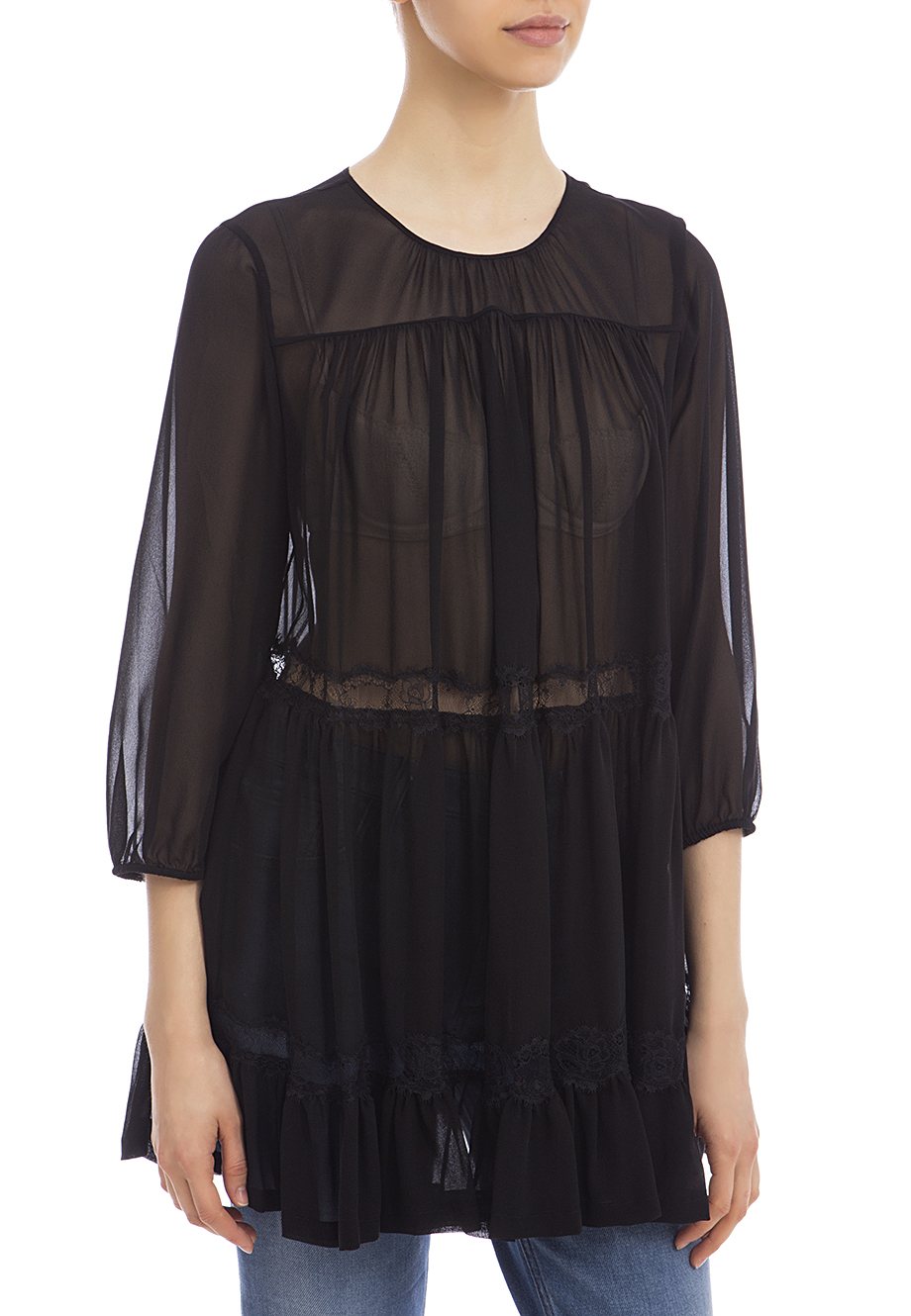 Детали: свободный воздушный крой, кокетка над грудью, круглый вырез горловины, втачной рукав длиной ¾ с тонкой манжетой. Ярусы оборок разделены кружевом, небольшая рюша по подолу. Застегивается пуговицей на спинке с вырезом-каплей.