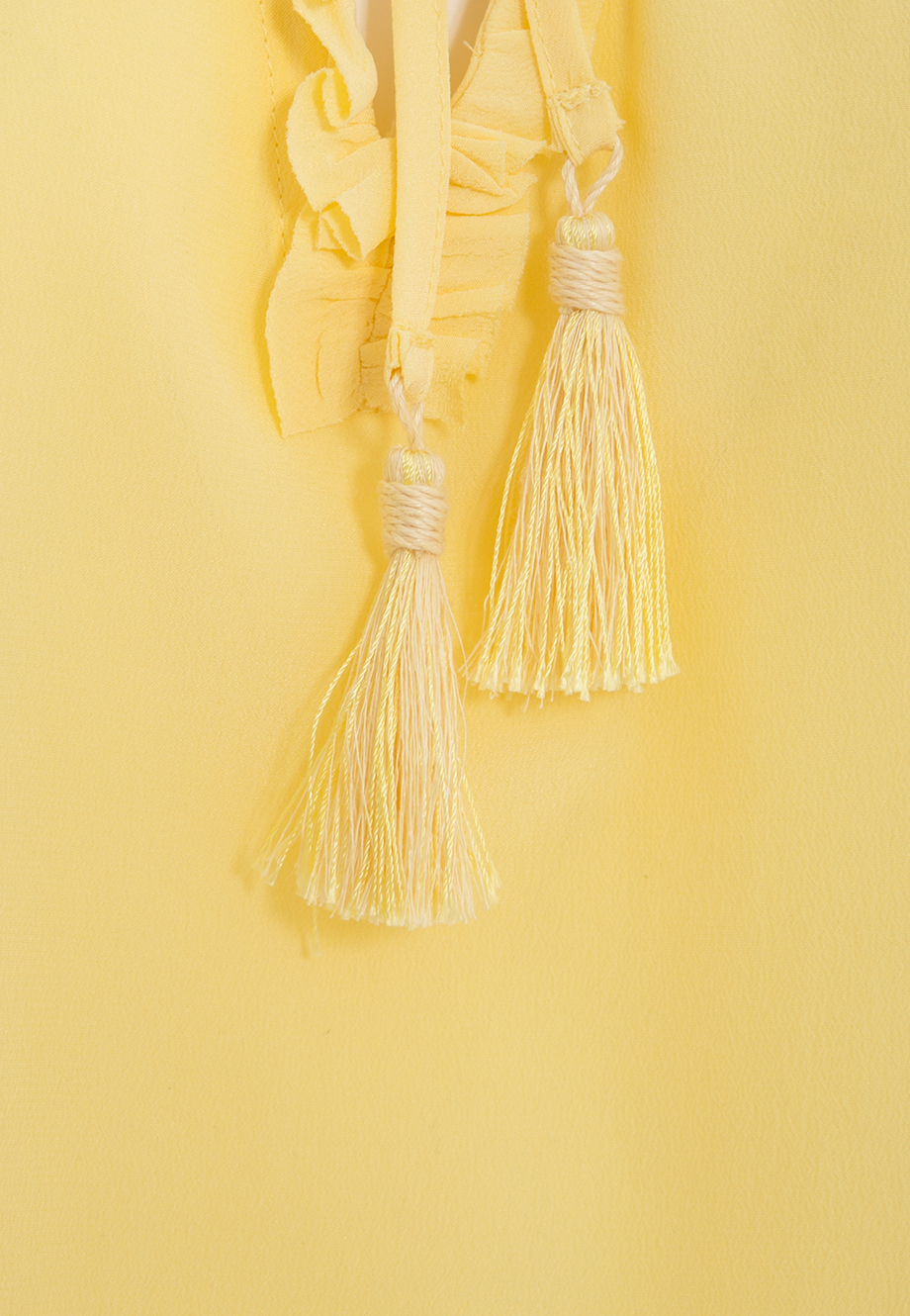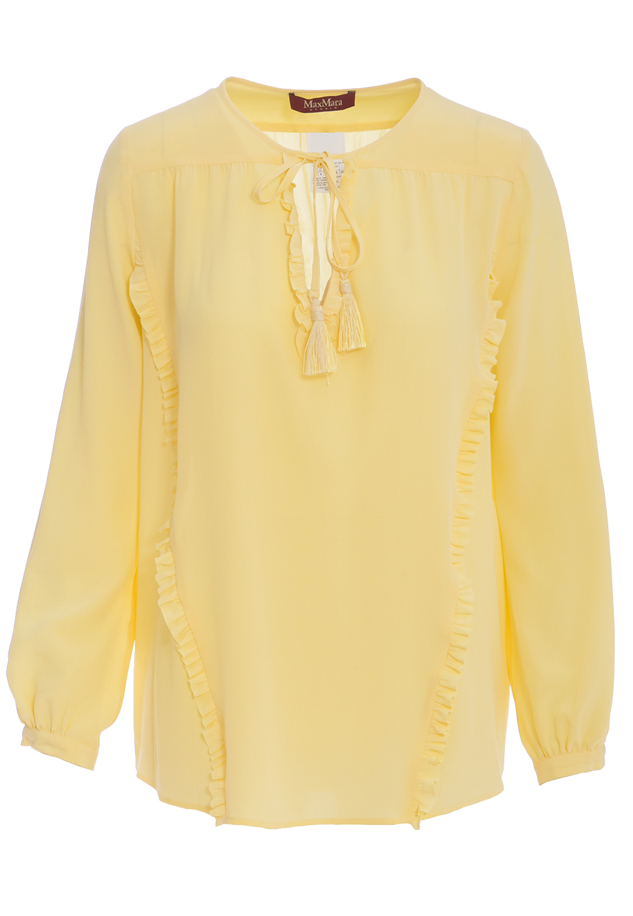 Детали: свободный крой, круглый вырез горловины на завязках с каплей, длинный втачной рукав, собранный узкой манжетой с пуговицей. Декорирована легкими рюшами с двух сторон.