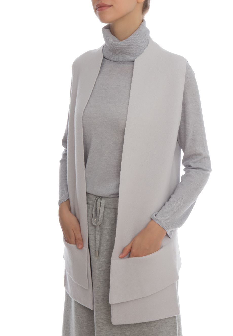 Детали: прямой крой, круглый выреза горловины, асимметричная длина передних полочек, прорезные карманы с широким отворотом. Без подклады.