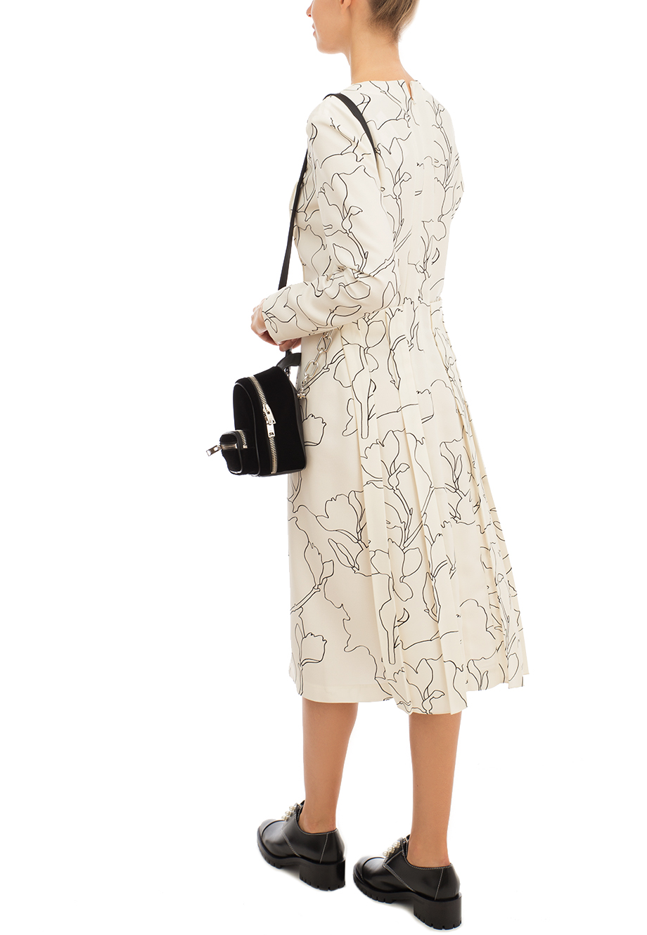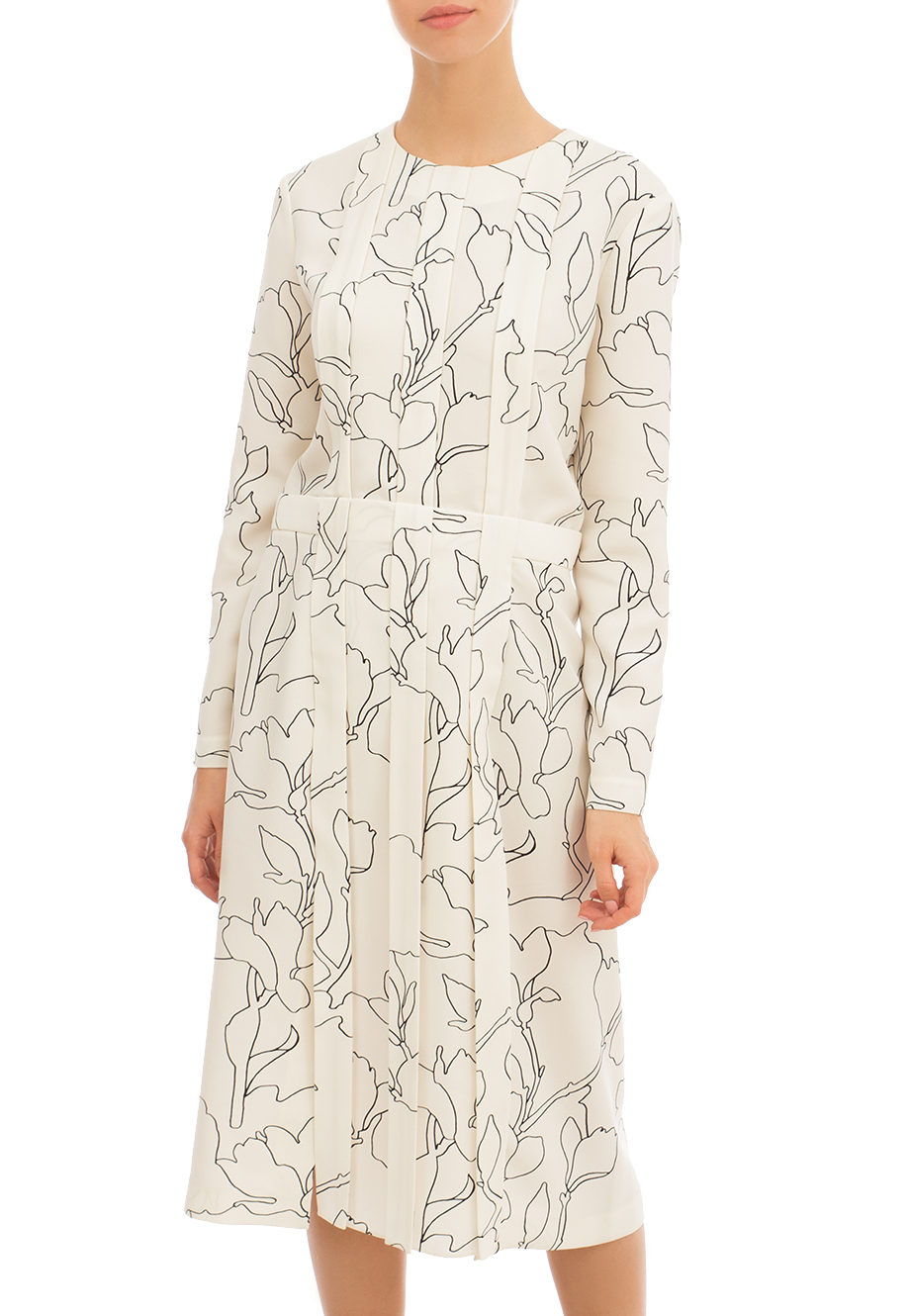 Детали: А-силуэт, отрезная линия талии, круглый вырез горловины, длинный втачной рукав, фигурные сборки от ворота, складки на юбке, длина миди. Флористический мотив паттерна