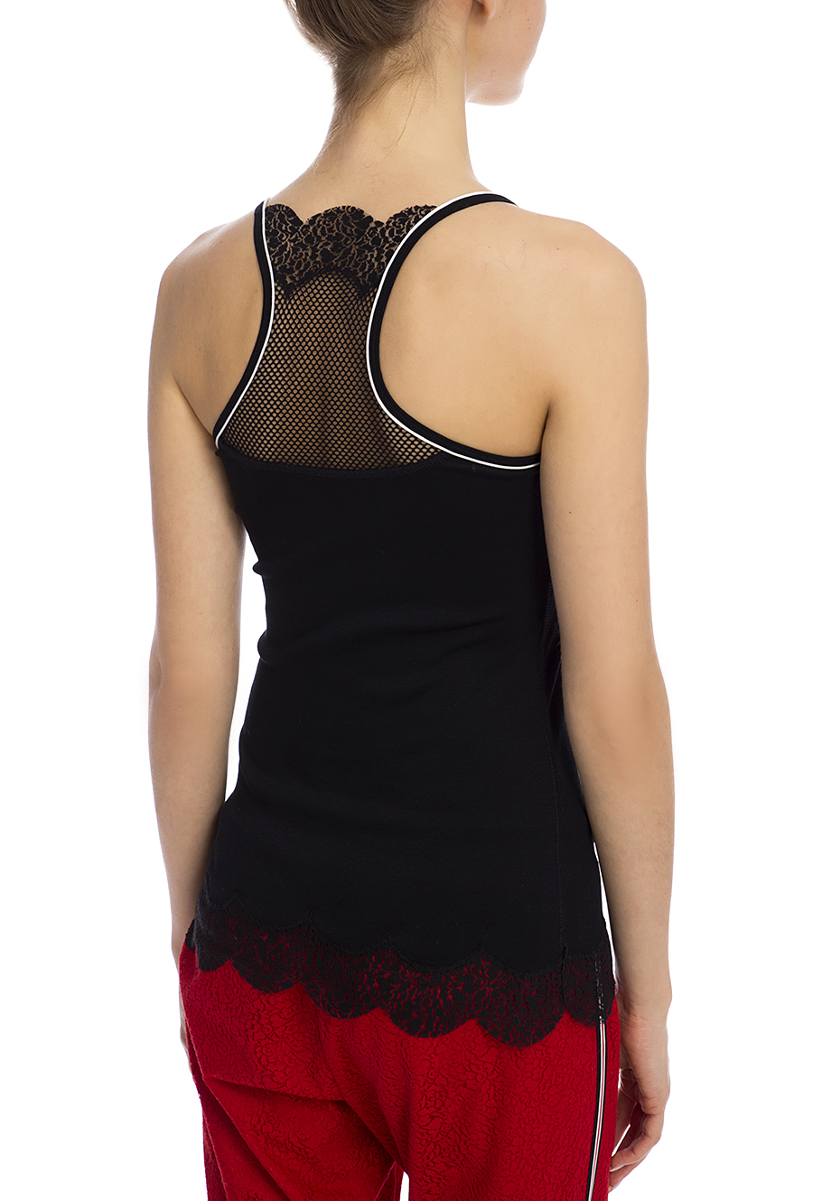 Детали: облегающий крой, тонкие лямки, спортивный крой спинки, ажурная отделка по линии декольте, по нижнему краю и на спинке.