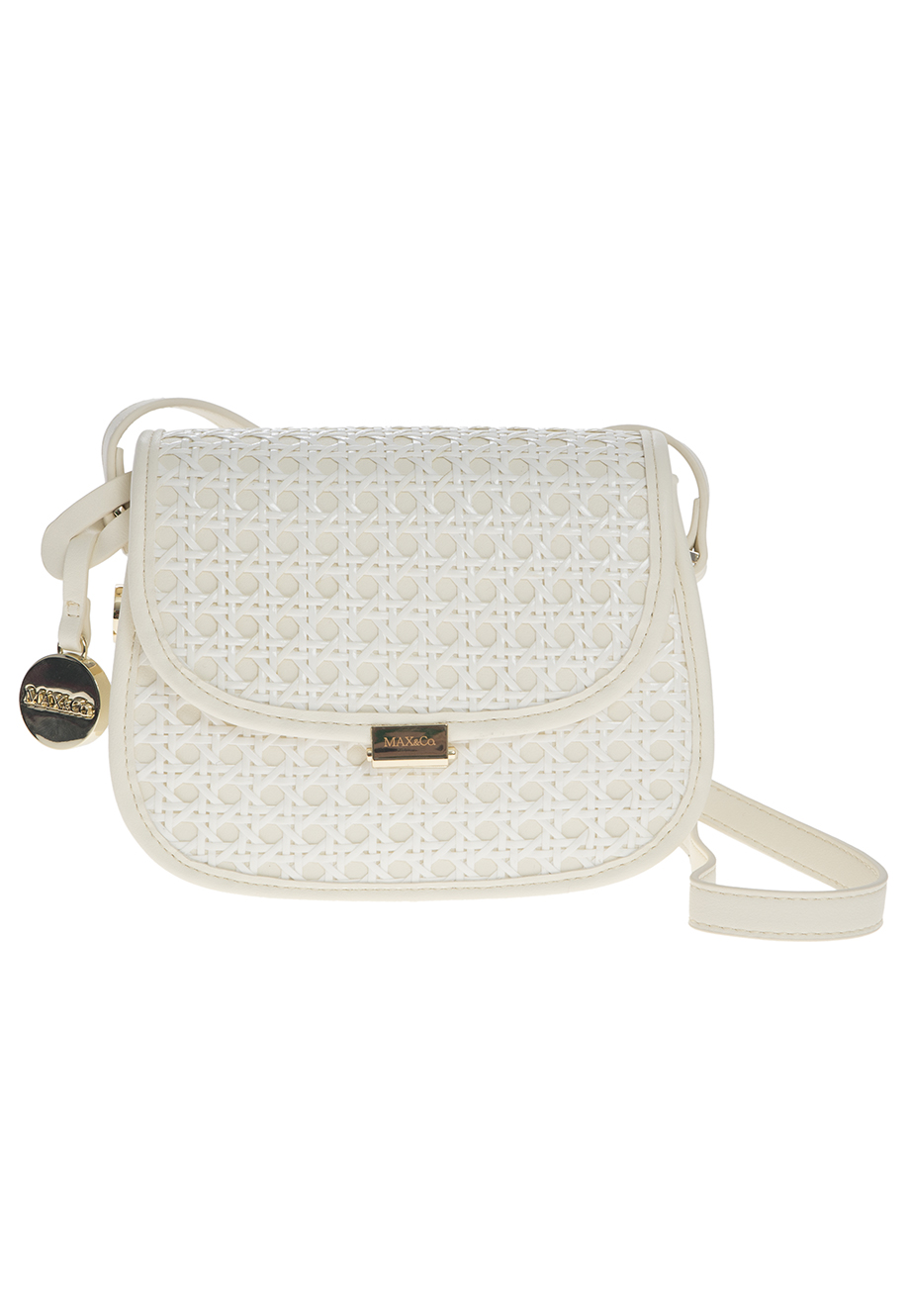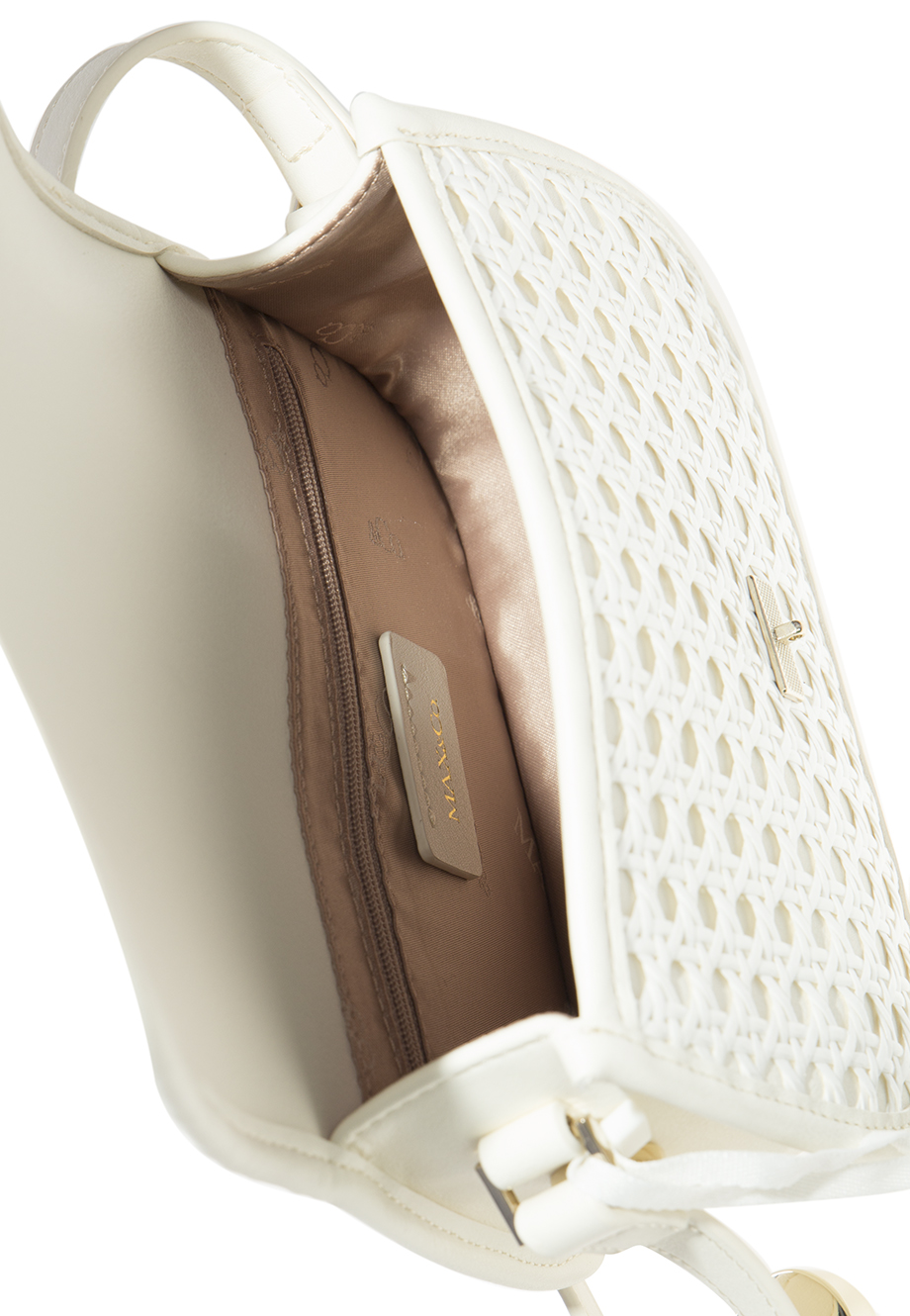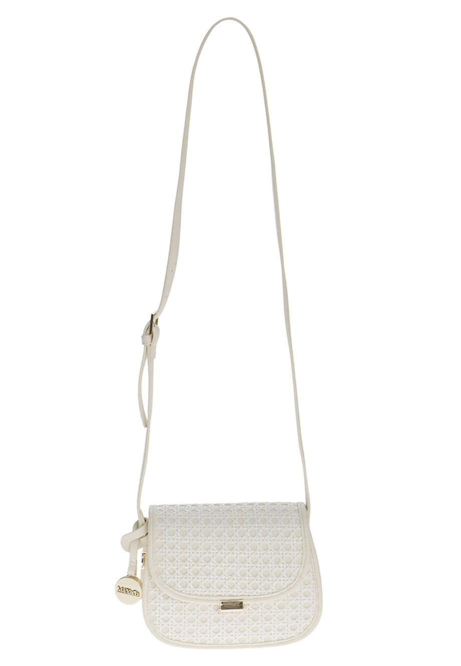 Детали: полукруглая форма, крышка-клапан со скрытой магнитной кнопкой, длинный плечевой ремень, декор плетением, фирменный подвесной брелок.