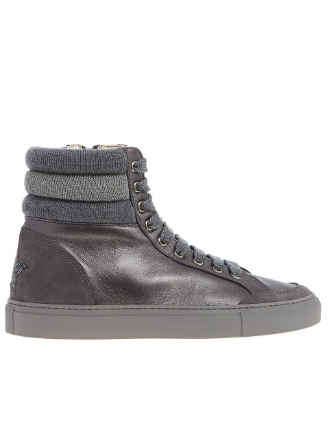 Детали: закруглённый носок с отделкой из замши, гладкая кожа с металлизированным напылением, шнуровка и трикотажные манжеты голенища с нитью люрекса. На пятке вставка из замши и звезда с глиттером.