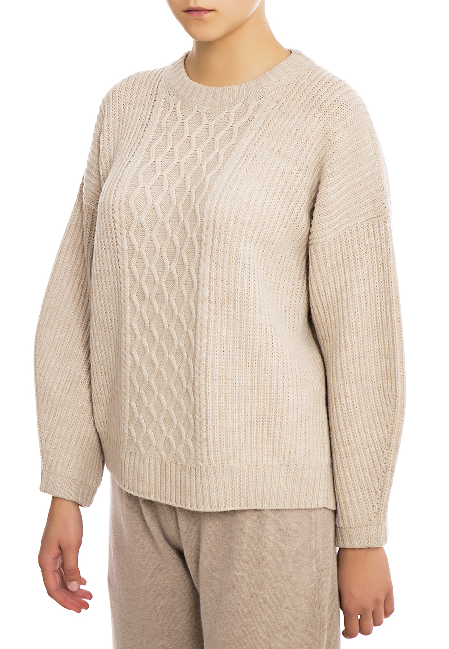 Детали: овальный крой, круглый вырез горловины, длинный спущенный рукав, вязаный узор, по нижнему краю и на рукавах вязаная резинка.