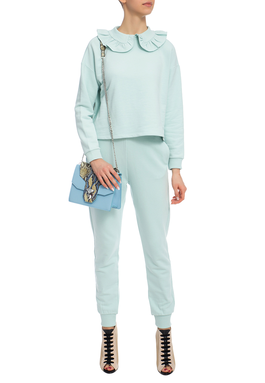 Детали: прямой крой, высокая посадка, эластичный пояс, прорезные карманы по боковым швам, по нижнему краю манжета.