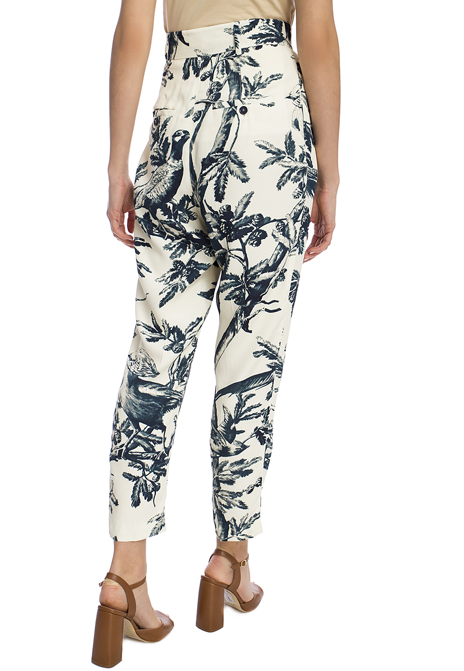 Детали: традиционный крой, слегка зауженный книзу, высокая посадка, защипы от пояса, два прорезных кармана с рантом и пуговицей сзади, пояс со шлёвками для ремня, пуговицы, ширинка, длина 7/8