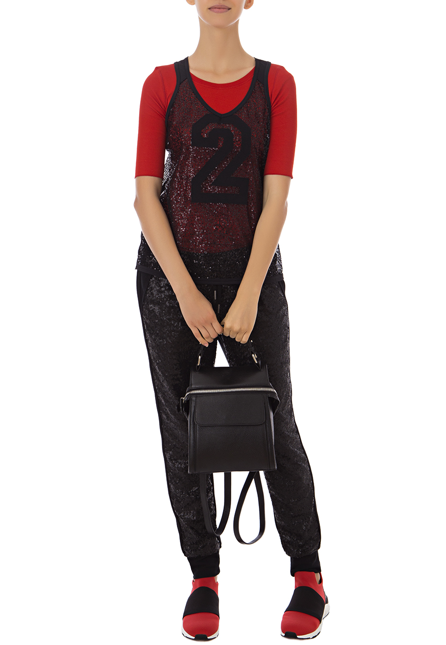Детали: традиционный крой, широкие лямки, круглый вырез декольте. Передняя полоска декорирована пайетками, спинка из спортивной сетки.
