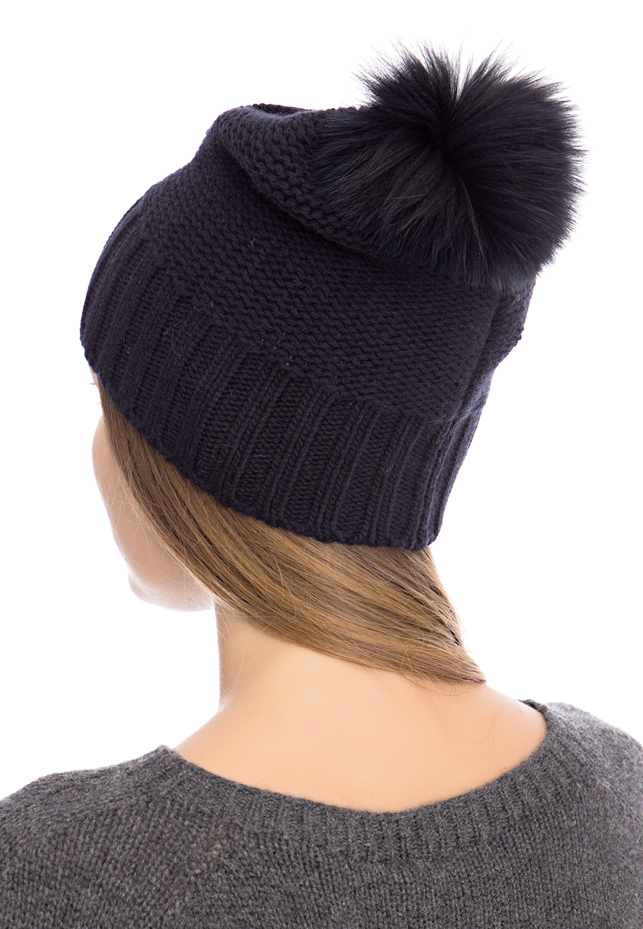 Детали: крупная вязка, узор, манжета резинкой, чёрный меховой помпон.