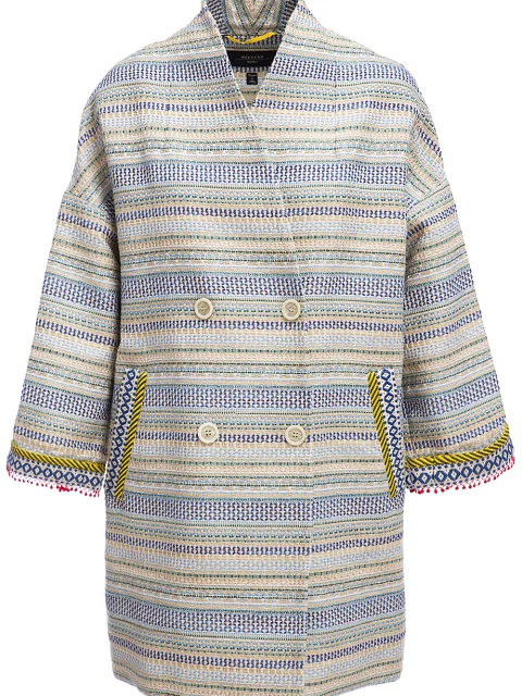 Детали: овальный крой, V-образная форма выреза, спущенные укороченные рукава длиной 7/8 с тесьмой и бахромой по краю. Прорезные карманы с рантом из тесьмы, двубортная застежка. Жаккардовый орнамент.