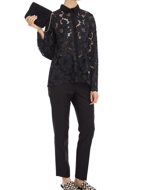 Делали: прямой крой, длинный втачной рукав, отложной воротник и планка из шёлка с потайными пуговицами. Фигурный нижний край.