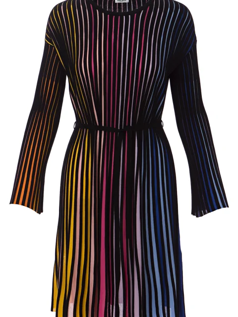 Детали: А-силуэт, круглый вырез горловины, спущенный длинный рукав, линия талии выделена поясом. Длина до колена, эффект гофре, сочетающий цвета радуги с черным.