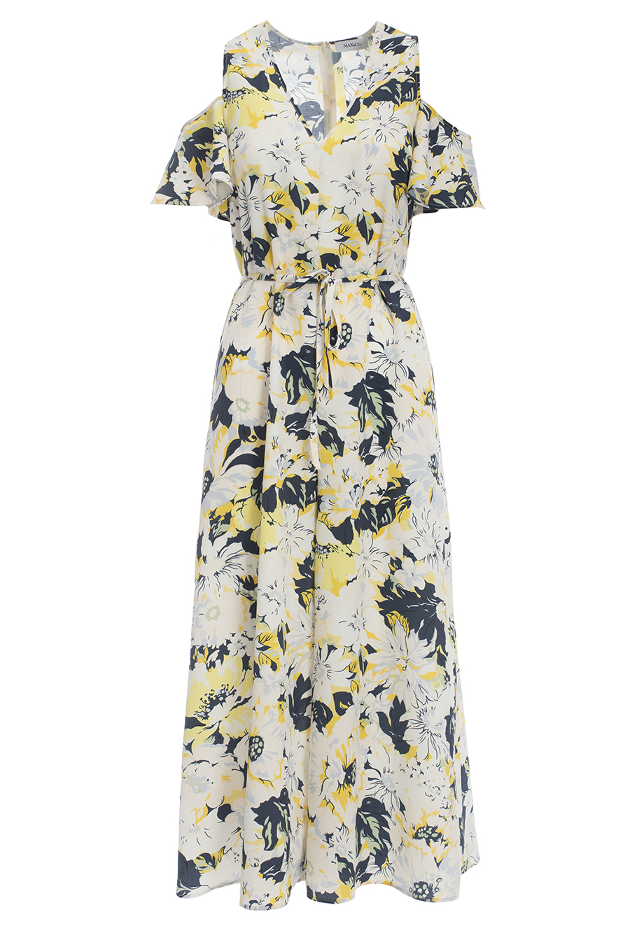 Детали: А-силуэт, крой клеш от бедра, длина миди, V-образная форма декольте, короткие рукава-воланы с вырезами на плечах, тонкий пояс по линии талии, цветочный принт.