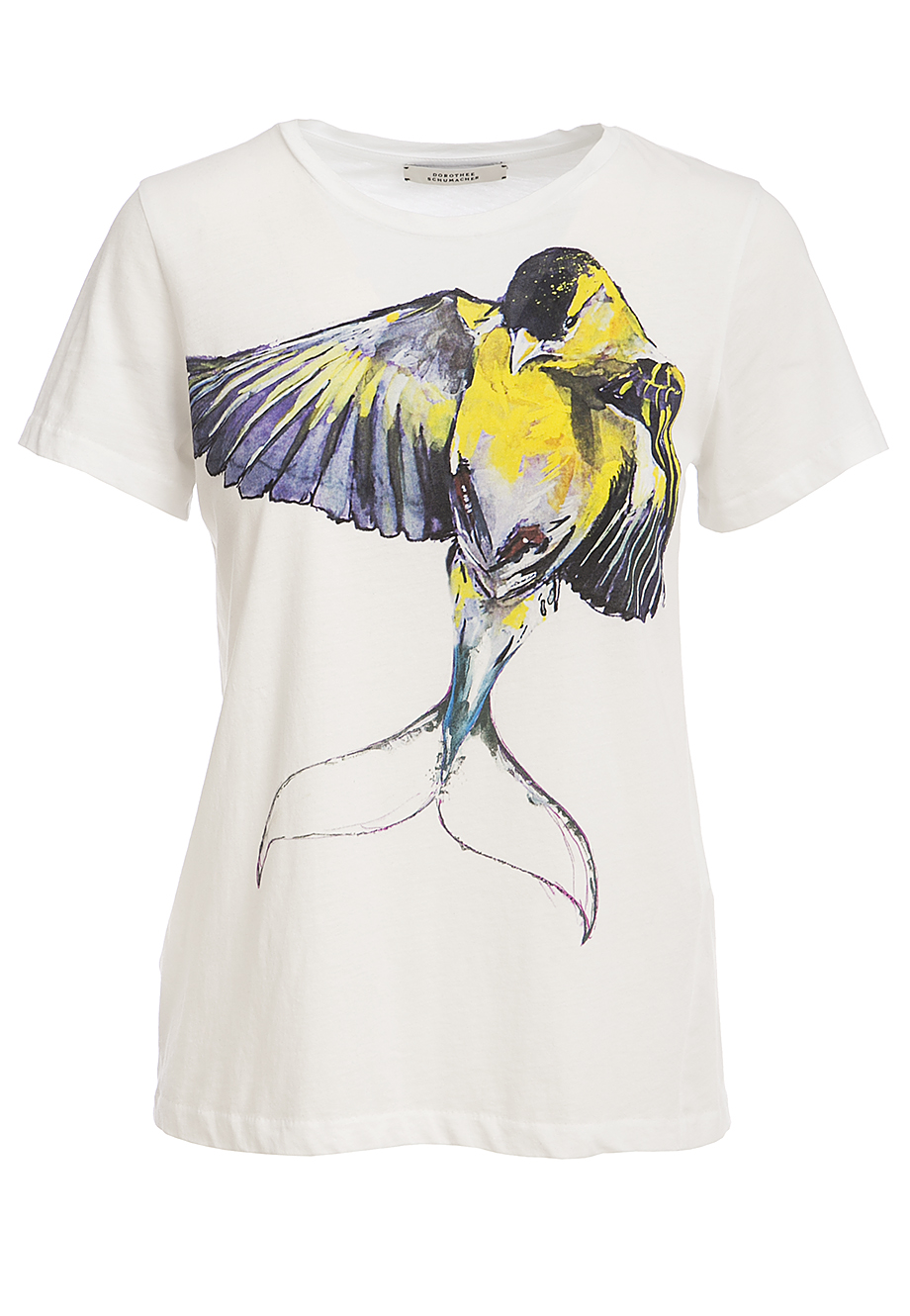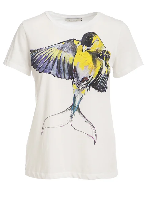Детали: прямой крой, круглый вырез горловины, короткий втачной рукав, рисунок в виде фантазийной птицы.