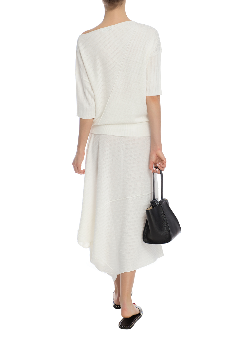 Детали: А-силуэт, высокая посадка, эластичный пояс, диагональный крой со свободным углом сбоку.