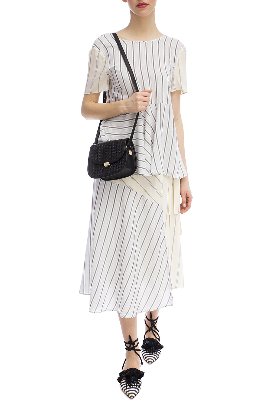 Детали: А-силуэт, высокая посадка, асимметричный крой из нескольких клиньев, сбоку ленты, принт – полоска.