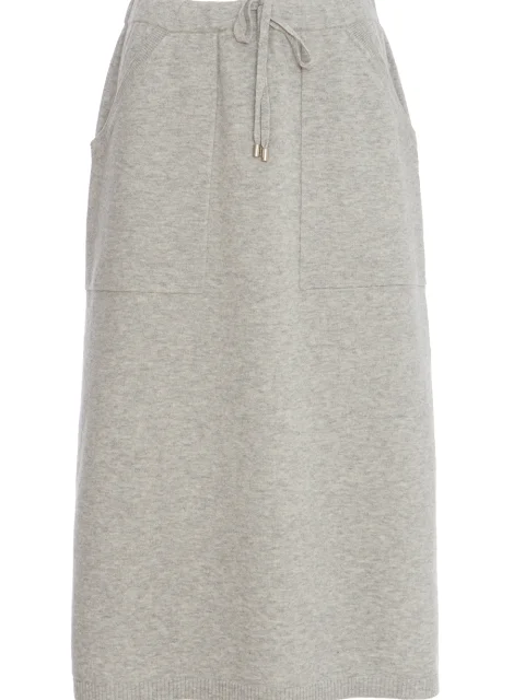 Детали: прямой крой, средняя посадка, пояс на кулиске со шнурком, накладные карманы карго по бокам, боковые разрезы, вязаная резинка по подолу и кромке карманов.