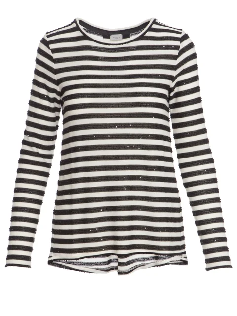 Детали: прямой крой, круглый вырез горловины, длинный втачной рукав, на спинке перевернутая складка, увеличенная длина. Черные полоски вышиты мелкими пайетками.