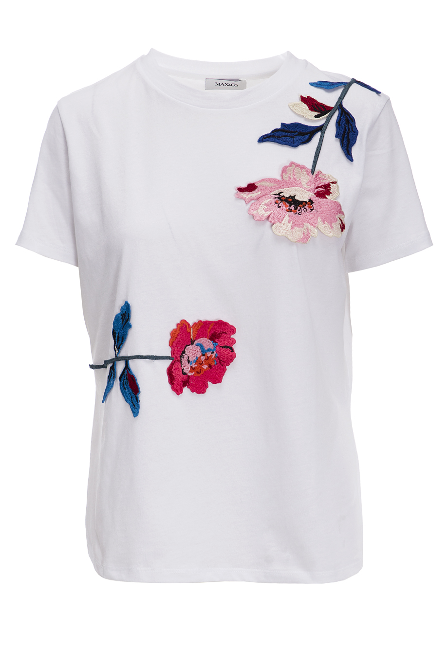 Детали: прямой крой, круглый вырез горловины, короткий втачной рукав, крупные цветочные нашивки.
