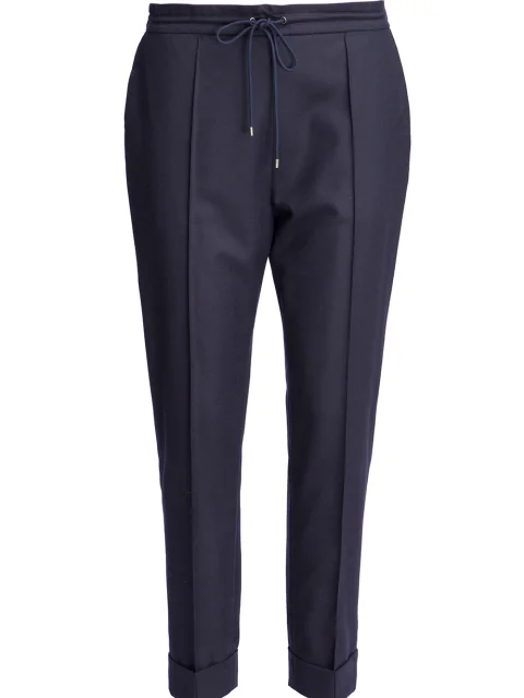 Детали: прямой крой, зауженный книзу, высокая посадка, прорезные карманы по боковым швам, прошитые стрелки вдоль штанин, отвороты по нижнему краю.