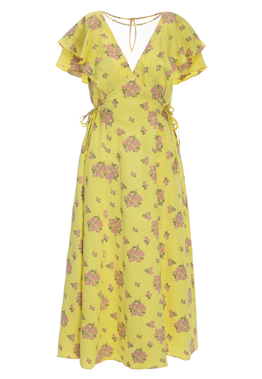 Детали: А-силуэт, V-образная форма декольте, квадратный вырез на спинке, рукава двойным воланом, завязки по бокам, длина миди, цветочный тканый рисунок.