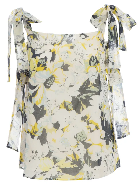 Детали: прямой свободный крой, двойные завязки лентами на плечах, цветочный принт.