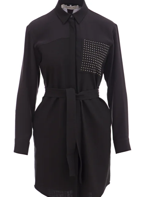 Детали: прямой свободный крой, отложной воротник, кокетка и втачной рукав с манжетой из крепа, основная часть из полированной шерсти. На груди карман декорирован клёпками. Линия талии выделена поясом. Планка со скрытым рядом пуговиц, закруглённый подол.