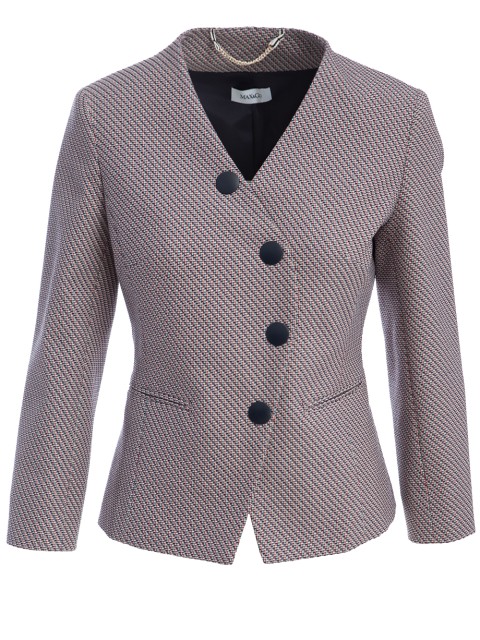 Детали: приталенный крой, V-образная форма декольте, укороченный втачной рукав, горизонтальные прорезные карманы. Застёгивается рядом пуговиц.
