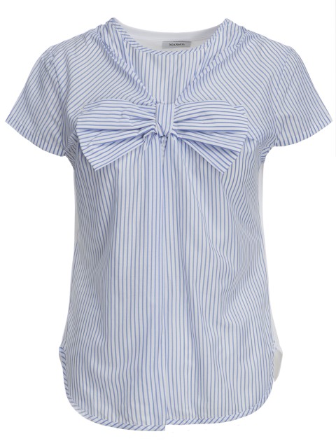 Детали: прямой крой, круглый вырез горловины, короткий втачной рукав, на груди декоративный бант, закругленный нижний край, боковые разрезы, спинка из джерси.